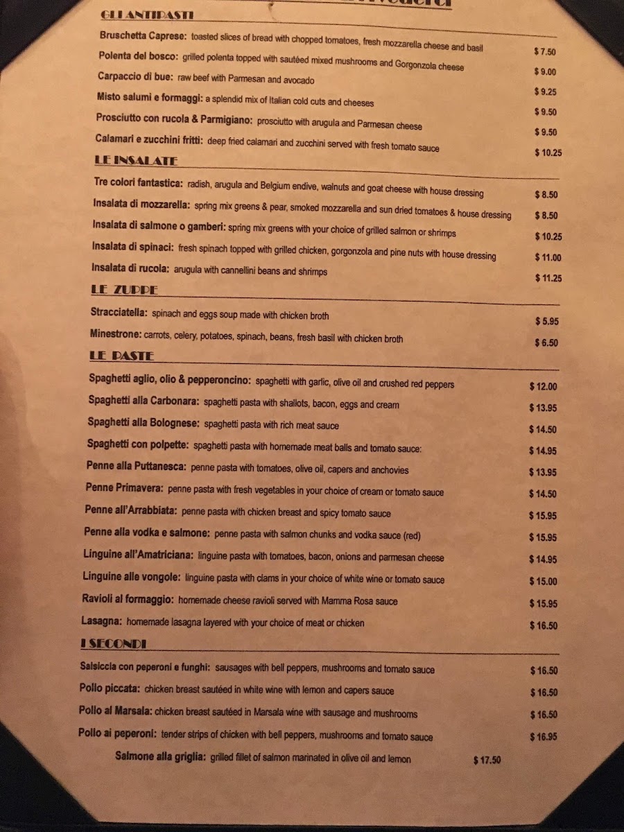 Don't forget to indulge in dessert—the classic Tiramisu and crispy Sicilian Cannolo, both priced at $9.00, promise to delight your taste buds!
